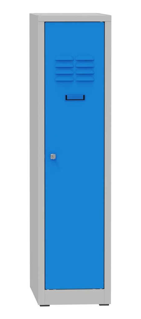 Šatní skříňka svařovaná, výška 1500 x šířka 400 x hloubka 500 mm. Uzamykání na cylindrický zámek nebo uzávěr pro visací zámek, vnitřní vybavení police s tyčí na ramínka a háček + svislá mezistěna pro oddělení čistých a špinavých oděvů. Na přání s navařenými nohami - výška skříně s nohami 1650 mm. Barva korpusu RAL 7035 světle šedá.