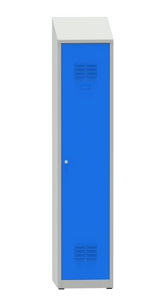 Šatní skříňka svařovaná, výška 1200 x šířka 300 x hloubka 500 mm. Uzamykání na cylindrický zámek nebo uzávěr pro visací zámek, vnitřní vybavení police s tyčí na ramínka a háček. Na přání s navařenými nohami - výška skříně s nohami 1350 mm. Barva korpusu RAL 7035 světle šedá.