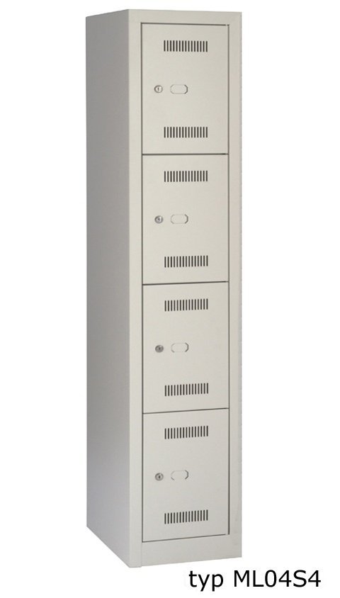 Svařovaná šatní skříň s dělenými dveřmi, na soklu nebo na nohách. Šířka oddělení 400 mm, výška 1700 mm, se soklem 1806 mm, s nohami 1850 mm, s podstavnou lavicí 2100 mm. Lavice je standardně vybavena rektifikačními patkami. Zámek možno zvolit jako cylindrický, s příplatkem uzávěr pro visací zámek nebo otočný kódový zámek. Barva korpusu světle šedá (RAL 7035), barva dveří dle výběru.