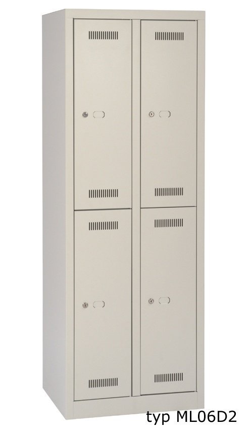 Svařovaná šatní skříň s dělenými dveřmi, na soklu nebo na nohách. Šířka oddělení 400 mm, výška 1700 mm, se soklem 1806 mm, s nohami 1850 mm, s podstavnou lavicí 2100 mm. Lavice je standardně vybavena rektifikačními patkami. Zámek možno zvolit jako cylindrický, s příplatkem uzávěr pro visací zámek nebo otočný kódový zámek. Barva korpusu světle šedá (RAL 7035), barva dveří dle výběru.