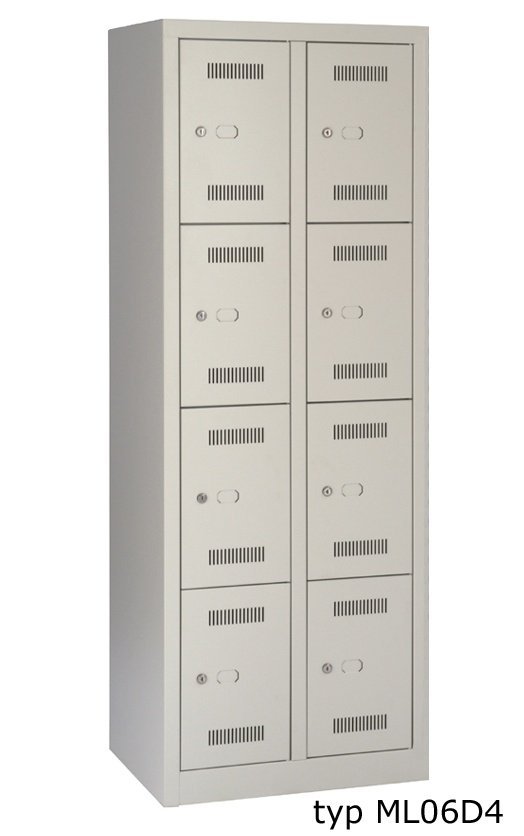 Svařovaná šatní skříň s dělenými dveřmi, na soklu nebo na nohách. Šířka oddělení 400 mm, výška 1700 mm, se soklem 1806 mm, s nohami 1850 mm, s podstavnou lavicí 2100 mm. Lavice je standardně vybavena rektifikačními patkami. Zámek možno zvolit jako cylindrický, s příplatkem uzávěr pro visací zámek nebo otočný kódový zámek. Barva korpusu světle šedá (RAL 7035), barva dveří dle výběru.