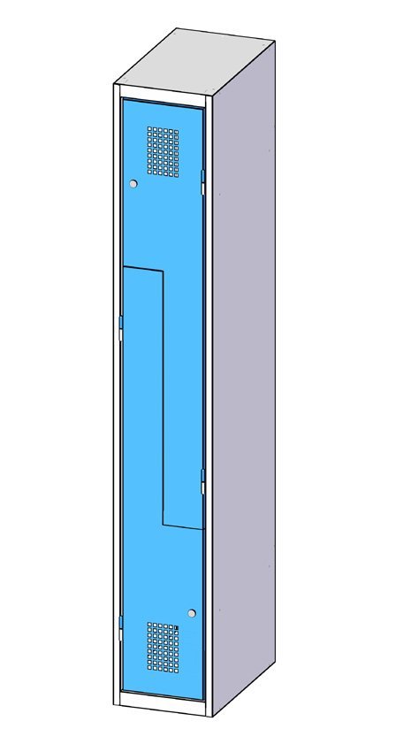 Šatní skříňka, dělené dveře do tvaru Z, výška 1850, šířka 600, hloubka 500 mm. Zamykání na cylindrický zámek nebo uzávěr. Dorazová plocha proti vpáčení, větrací mřížky, různé barevné kombinace. Průchozí šířka šatní buňky 250/115 mm. Cena bez štítku pro jmenovku.