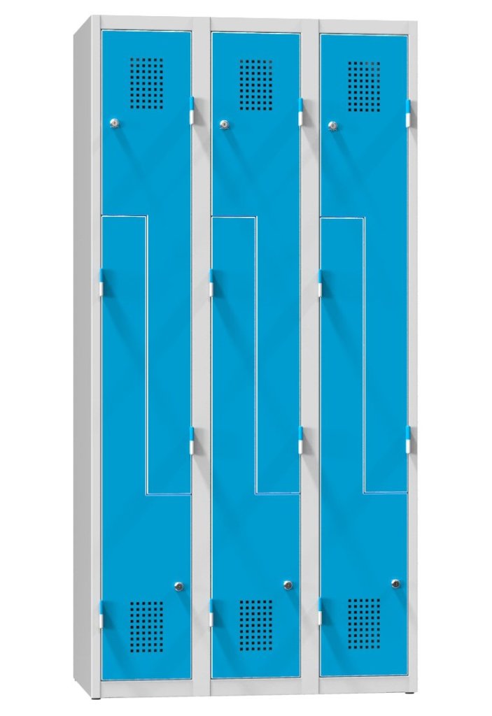 Šatní skříňka, dělené dveře do tvaru Z, výška 1850, šířka 900, hloubka 500 mm. Zamykání na cylindrický zámek nebo uzávěr. Dorazová plocha proti vpáčení, větrací mřížky, různé barevné kombinace. Průchozí šířka šatní buňky 250/115 mm. Cena bez štítku pro jmenovku.