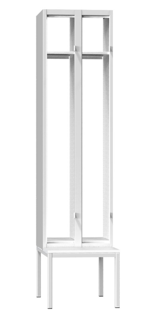 Dvoudveřová kovová šatní skříňka s podstavnou lavicí, šířka 500, 600 nebo 800 mm, výška 2080 mm, hloubka 500 mm, v horní části každého oddělení je polička a tyč se třemi plastovými háčky. Cena bez štítku pro jmenovku.