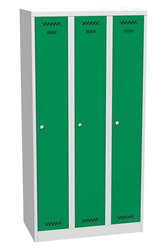 Tříoddílový svařovaný šatník šířky 900 mm s šířkou oddílu 300 mm, výška 1800 mm, hloubka 500 mm. Uzamykání cylindrickým zámkem se dvěma klíči, nebo otočným zámkem pro visací zámek. Barva korpusu světle šedá, barva dveří šedá, modrá, červená, zelená nebo žlutá. V každém oddílu je ohyb zabraňující vtlačení dveří dovnitř skříně a vypáčení zámku.