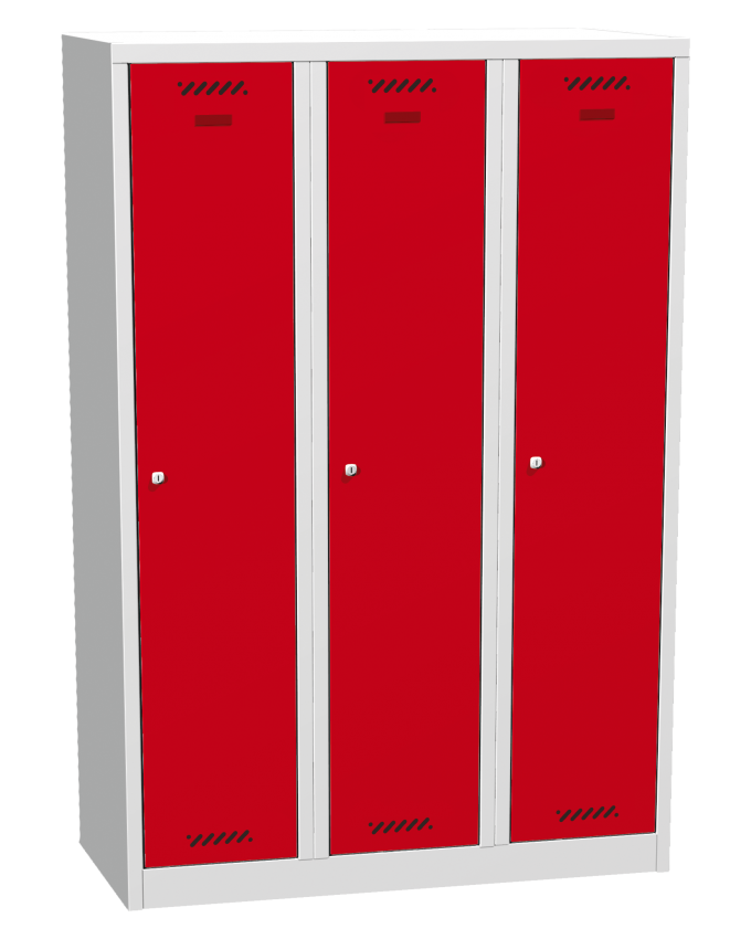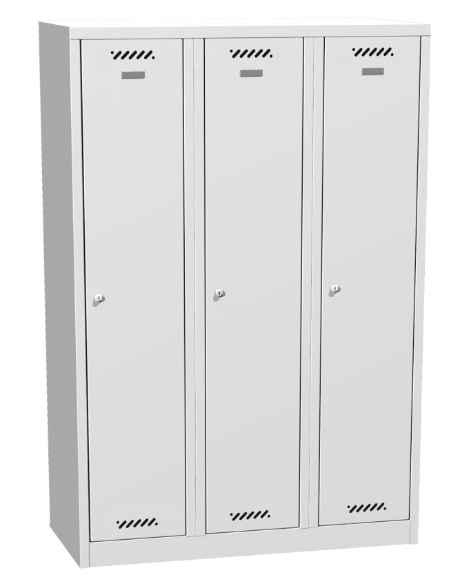 Tříoddílový svařovaný šatník šířky 900 mm s šířkou oddílu 300 mm, výška 1800 mm, hloubka 500 mm. Uzamykání cylindrickým zámkem se dvěma klíči, nebo otočným zámkem pro visací zámek. Barva korpusu světle šedá, barva dveří šedá, modrá, červená, zelená nebo žlutá. V každém oddílu je ohyb zabraňující vtlačení dveří dovnitř skříně a vypáčení zámku.
