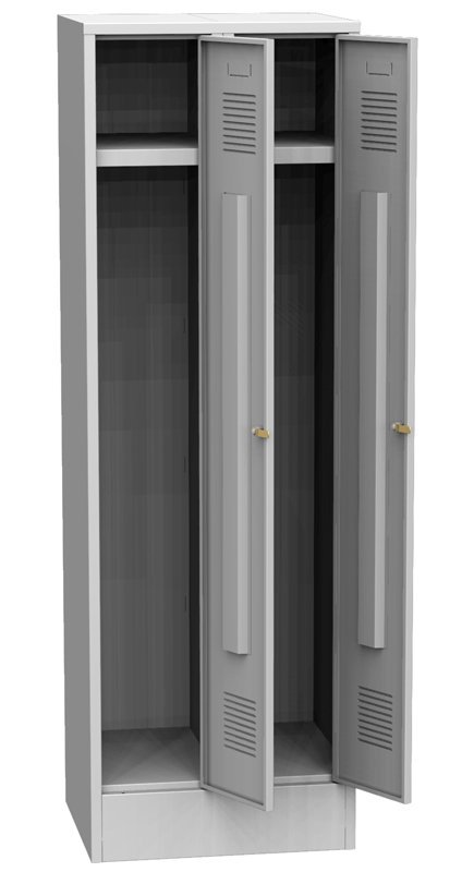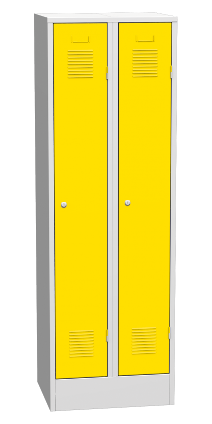 Dvoudveřová kovová šatní skříňka na soklu střední, šířka 600, výška 1500, hloubka 500 mm. Barva korpusu RAL 7035 světle šedá.