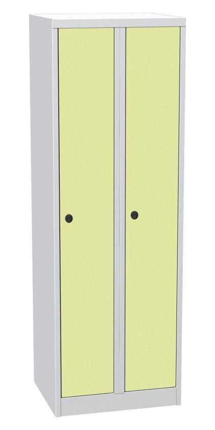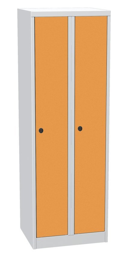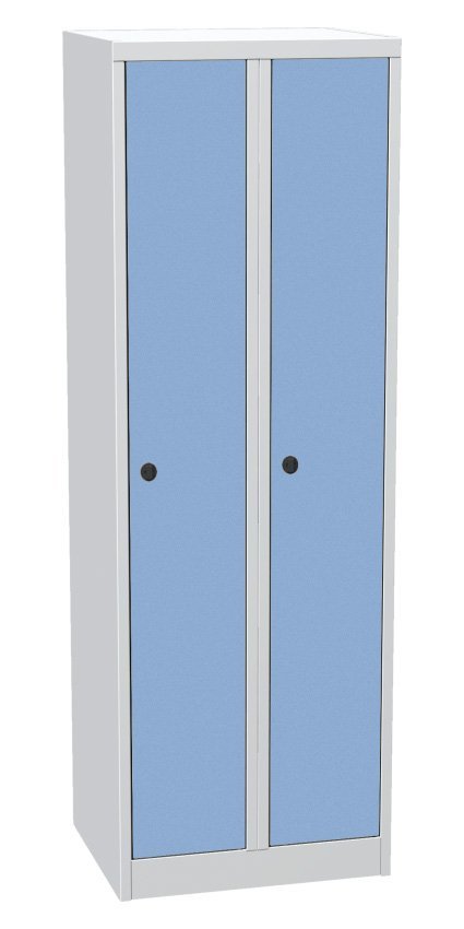 Dvouoddílový svařovaný šatník výška 1800 x šířka 600 x hloubka 493 mm. Uzamykání cylindrickým zámkem se dvěma klíči, nebo otočným zámkem pro visací zámek. Barva korpusu světle šedá, dveře HPL lamino v dezénu modrá, světle zelená nebo světle oranžová. V každém oddílu je ohyb zabraňující vtlačení dveří dovnitř skříně a vypáčení zámku.