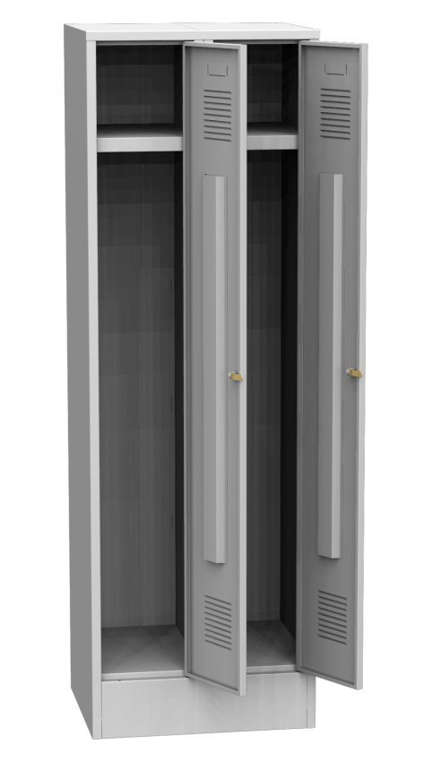 Dvouoddílový svařovaný šatník výška 1800 x šířka 600 x hloubka 500 mm. Uzamykání cylindrickým zámkem se dvěma klíči, nebo otočným zámkem pro visací zámek. Barva korpusu světle šedá, dveře lamino buk, bříza nebo třešeň. V každém oddílu je ohyb zabraňující vtlačení dveří dovnitř skříně a vypáčení zámku.