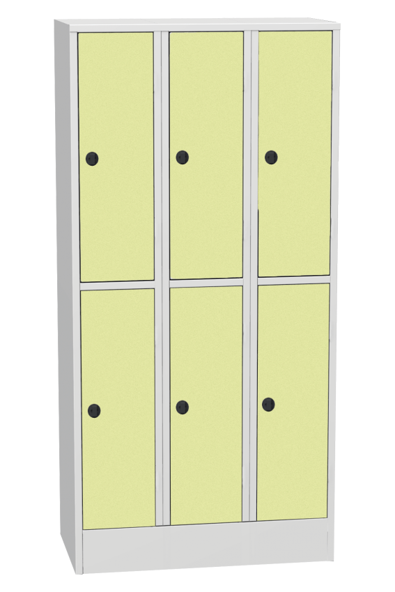 Šestidveřová kovová šatní skříňka dělená, šířka 900, výška 1850, hloubka 493 mm. Kovový korpus v barvě světle šedé RAL 7035, dveře HPL lamino v dezénu modrá, světle zelená nebo světle oranžová. Cylindrický zámek s dvěma klíči nebo uzávěr pro visací zámek. Vnitřní výbava každého oddělení - tyč se třemi posuvnými háčky.