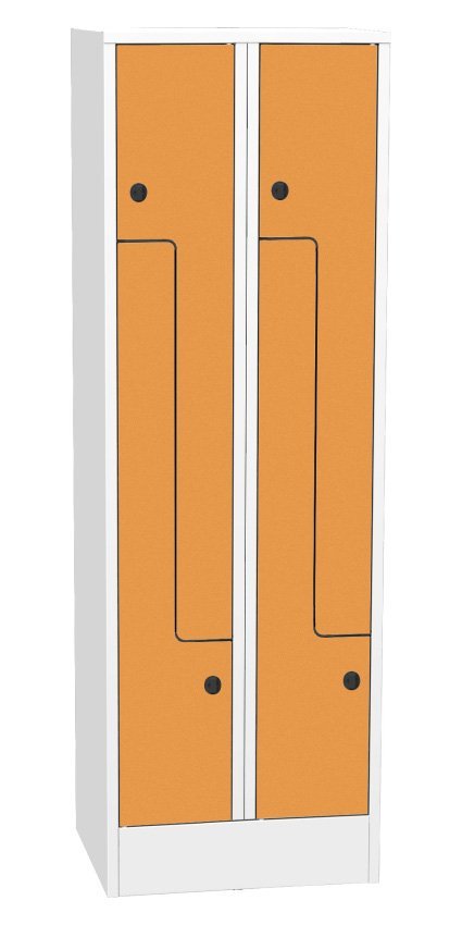 Dvoudveřová kovová šatní skříňka dělená, šířka 400, výška 1850, hloubka 493 mm. Kovový korpus v barvě světle šedé RAL 7035, dveře HPL lamino v dezénu modrá, světle zelená nebo světle oranžová. Cylindrický zámek s dvěma klíči nebo uzávěr pro visací zámek.