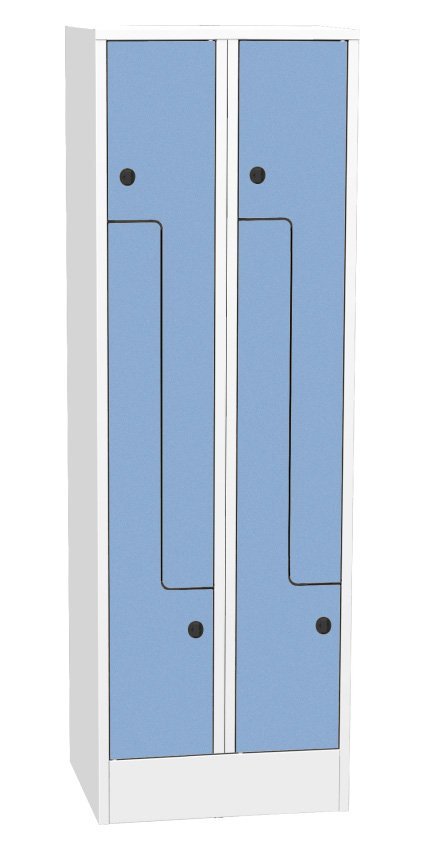 Dvoudveřová kovová šatní skříňka dělená, šířka 300, výška 1850, hloubka 493 mm. Kovový korpus v barvě světle šedé RAL 7035, dveře HPL lamino v dezénu modrá, světle zelená nebo světle oranžová. Cylindrický zámek s dvěma klíči nebo uzávěr pro visací zámek.