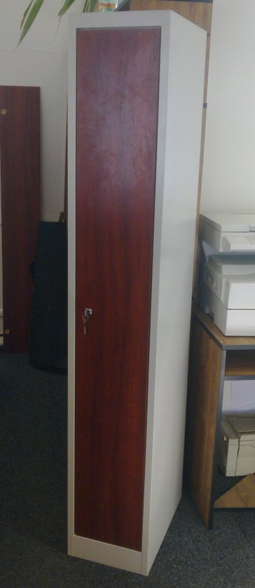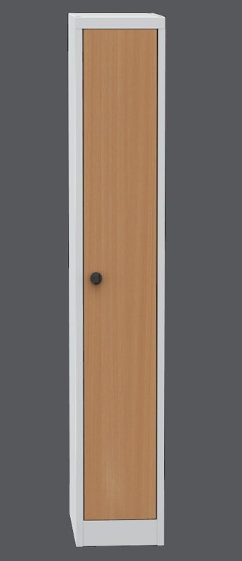 Jednooddílový svařovaný šatník s šířkou oddílu 300 mm, výška 1800 mm, hloubka 500 mm. Uzamykání cylindrickým zámkem se dvěma klíči, nebo otočným zámkem pro visací zámek. Barva korpusu světle šedá, dveře lamino buk nebo třešeň. V každém oddílu je ohyb zabraňující vtlačení dveří dovnitř skříně a vypáčení zámku.