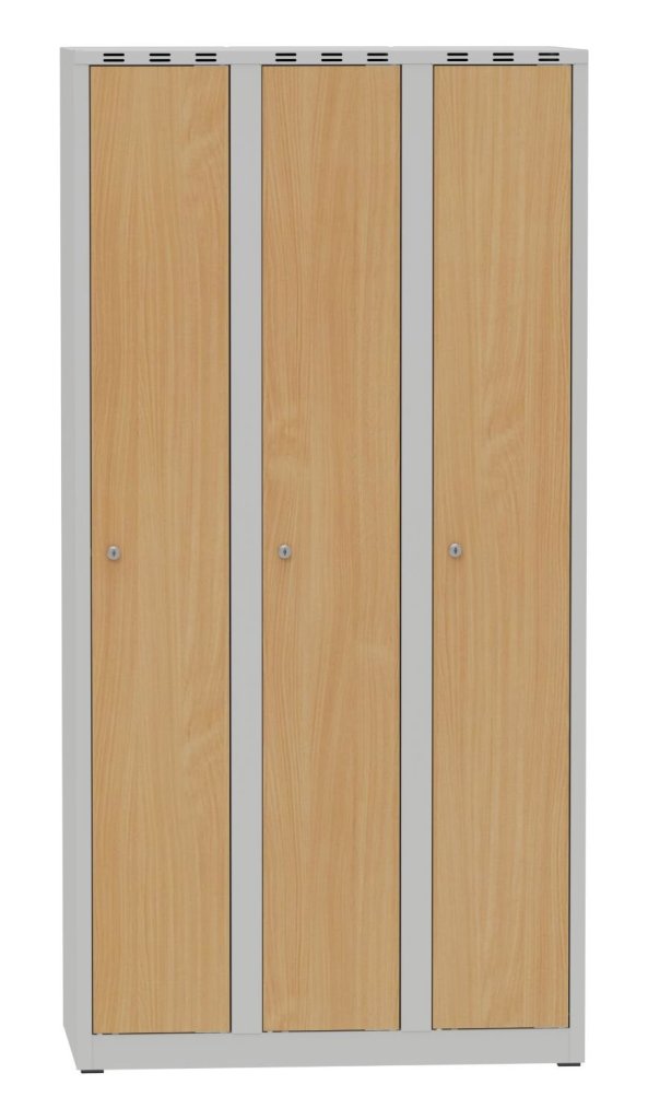 Šatní skříňka kovová s lamino dveřmi v dezénu buk. Výška 1800 x šířka 900 x hloubka 500 mm, 3 oddělení. Zamykání na klíč nebo uzávěr pro visací zámek. Dodáváno na soklu nebo na nohách (v tom případě se výška skříně zvýší o 150 mm). Barva korpusu světle šedá RAL 7035.