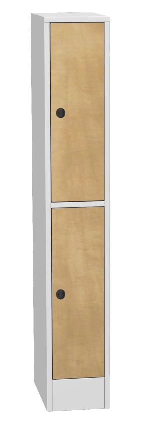 Dvoudveřová kovová šatní skříňka dělená, šířka 300, výška 1850, hloubka 500 mm. Kovový korpus v barvě světle šedé RAL 7035, dveře lamino v dezénu buk, bříza nebo třešeň. Cylindrický zámek s dvěma klíči nebo uzávěr pro visací zámek. Vnitřní výbava každého oddělení - police a tyč se třemi posuvnými háčky.