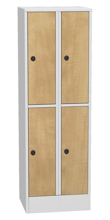 Čtyřdveřová kovová šatní skříňka dělená, šířka 600, výška 1850, hloubka 500 mm. Kovový korpus v barvě světle šedé RAL 7035, dveře lamino v dezénu buk, bříza nebo třešeň. Cylindrický zámek s dvěma klíči nebo uzávěr pro visací zámek. Vnitřní výbava každého oddělení - police a tyč se třemi posuvnými háčky.