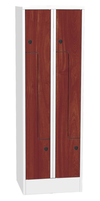 Dvoudveřová kovová šatní skříňka dělená, šířka 300, výška 1850, hloubka 500 mm. Kovový korpus v barvě světle šedé RAL 7035, dveře lamino v dezénu buk, bříza nebo třešeň. Cylindrický zámek s dvěma klíči nebo uzávěr pro visací zámek.