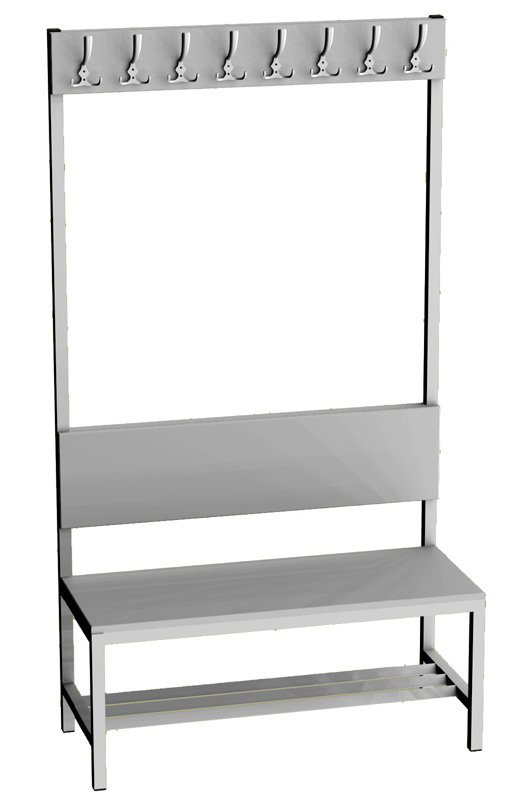 Šatnová lavice s opěradlem a věšákem 1000 mm oboustranná. Výška 1800, šířka 1000, hloubka 830 mm, 16 věšáků (8 x 2). Barva světle šedá RAL 7035.