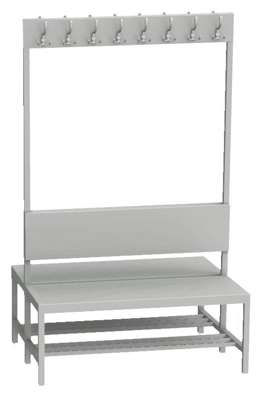 Šatnová lavice s opěradlem a věšákem 1000 mm oboustranná. Výška 1800, šířka 1000, hloubka 830 mm, 16 věšáků (8 x 2). Barva světle šedá RAL 7035.