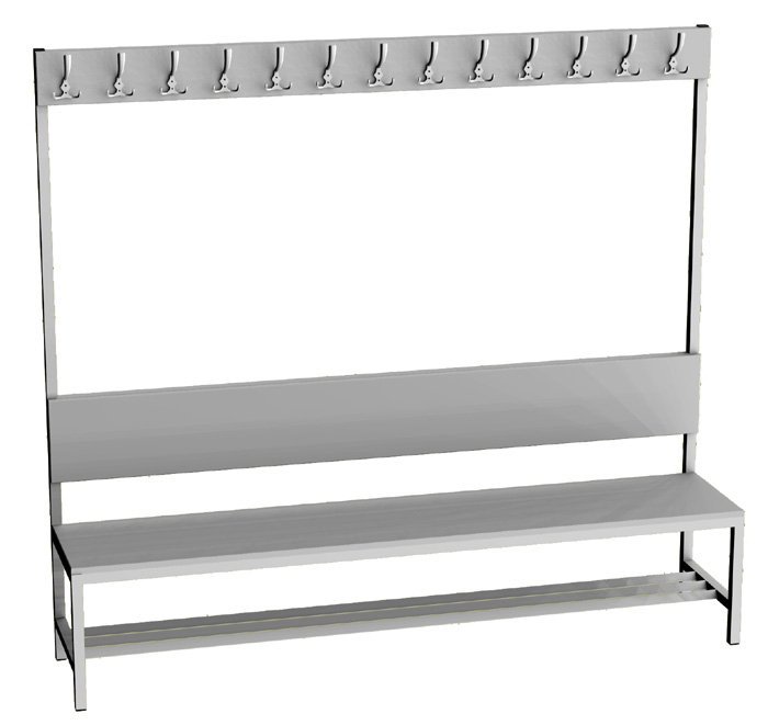Šatnová lavice s opěradlem a věšákem 2000 mm oboustranná. Výška 1800, šířka 2000, hloubka 830 mm, 26 věšáků (13 x 2). Barva světle šedá RAL 7035.