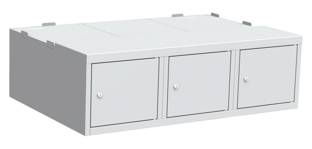 Šatnový podstavec třídveřový, šířka 1200, výška 370, hloubka 810 mm. Barva korpusu RAL 7035 světle šedá.