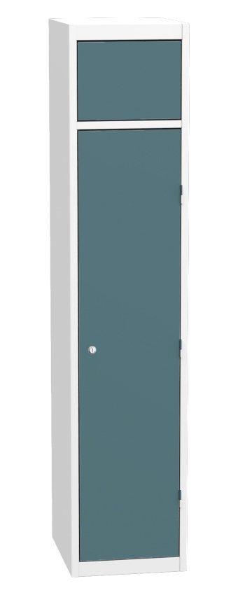 Skříň pro výdej čistých pracovních oděvů, šířka 380, výška 1770, hloubka 460 mm. Obsahuje čtyři výdejní boxy a jeden centrální rám pro obsluhu. Každá výdejní schránka a centrální rám pro obsluhu jsou uzamčeny cylindrickým zámkem. Barva korpusu RAL 7035 světle šedá.