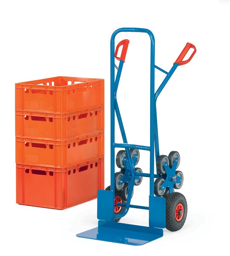 Ocelový rudl německé výroby pro přepravu zboží po schodech, konstrukce ze svařované oceli, lopata z ocelového plechu, ochranná madla pro ruce. Speciální pneumatická kolečka Fetra TPE - 2 trojramenná kola, každé kolo je vybaveno 3 TPE pneumatikami o průměru 160 mm.