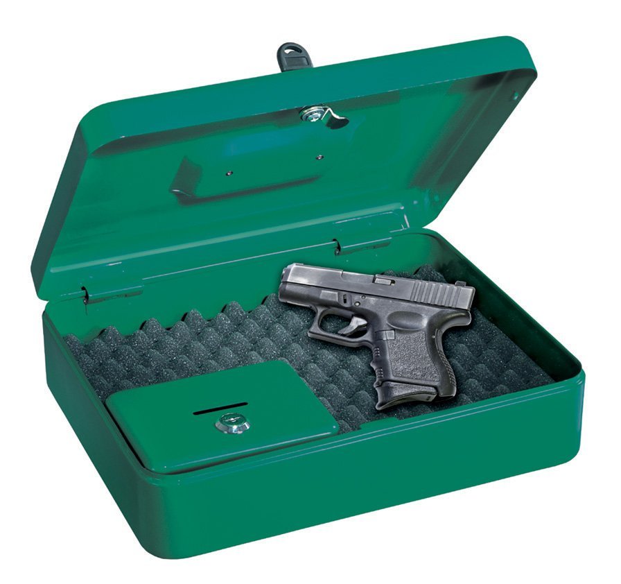 Schránka na krátké zbraně je vyrobena z kvalitního plechu, poniklovaný držák, uzamykatelná. Výška 90 x šířka 300 x hloubka 240 mm. Barva RAL 6002 zelená.