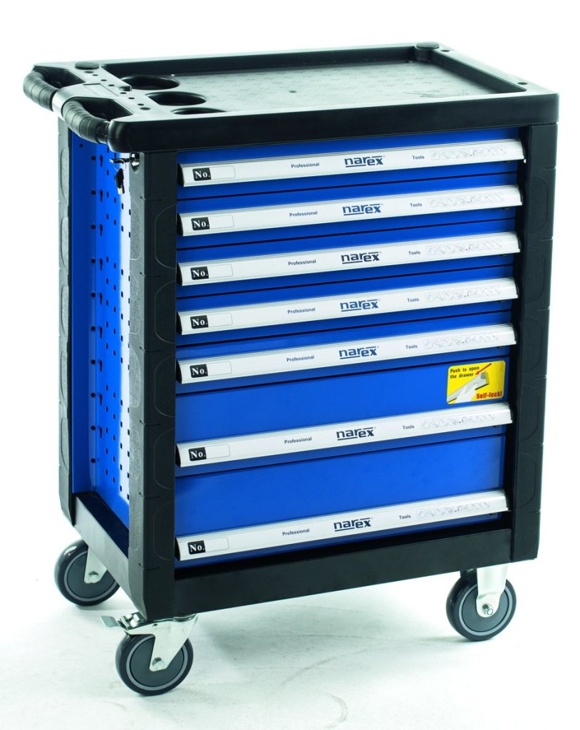 7zásuvkový dílenský servisní vozík. Výška 970 x šířka 748 x hloubka 515 mm. 6x zásuvka 60 mm a 1x zásuvka 210 mm. 2 otočná a 2 pevná kolečka, madlo. Barva modrá/antracit.