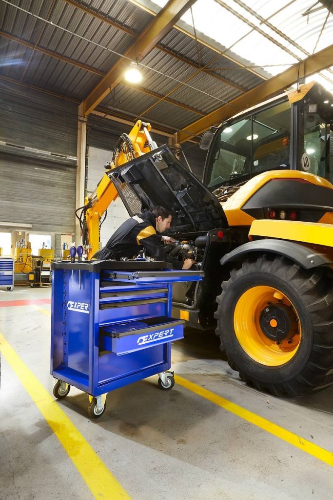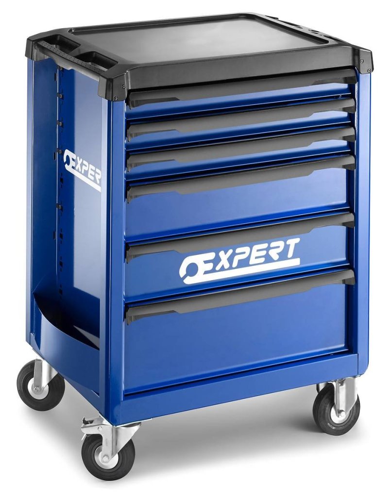 6zásuvkový dílenský servisní vozík. Výška 970 x šířka 748 x hloubka 515 mm. 3x zásuvka 60 mm, 2x zásuvka 130 mm a 1x zásuvka 200 mm. 2 otočná a 2 pevná kolečka, madlo. Barva modrá/antracit.
