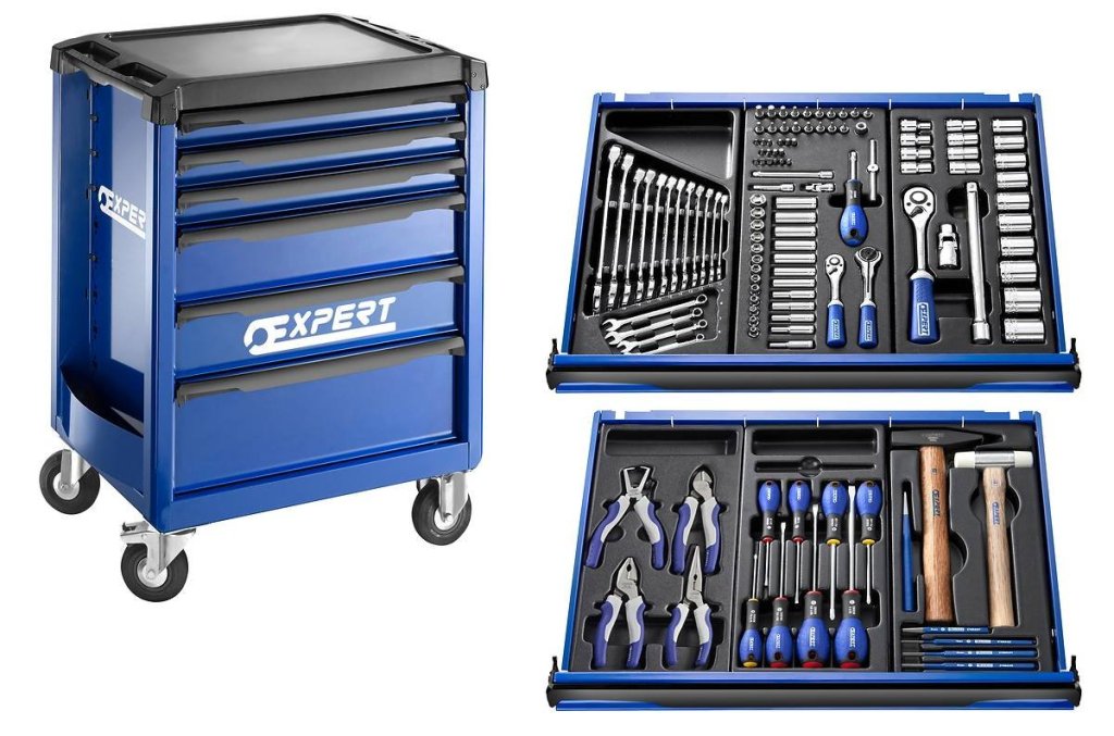 7zásuvkový dílenský servisní vozík. Výška 970 x šířka 748 x hloubka 515 mm. 6x zásuvka 60 mm a 1x zásuvka 210 mm. 2 otočná a 2 pevná kolečka, madlo. Barva modrá/antracit.