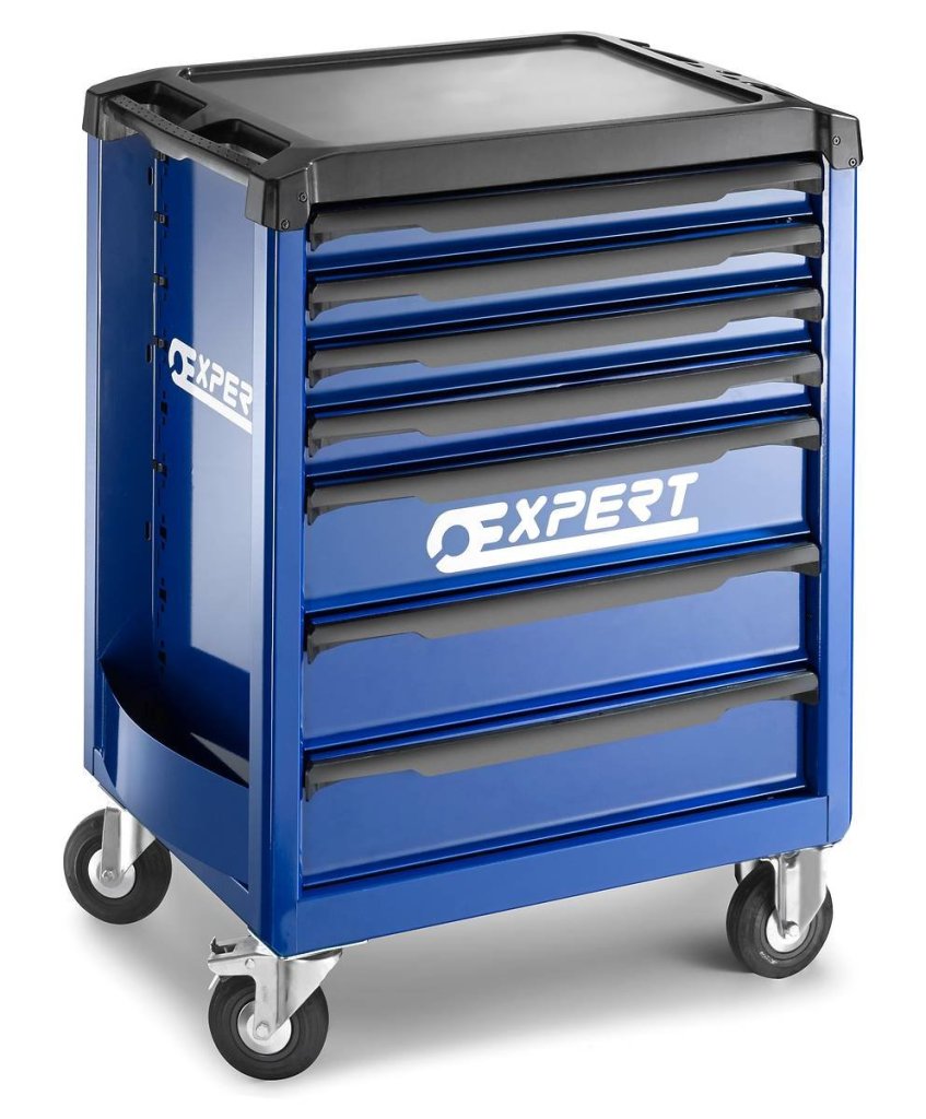 7zásuvkový dílenský servisní vozík. Výška 970 x šířka 748 x hloubka 515 mm. 6x zásuvka 60 mm a 1x zásuvka 210 mm. 2 otočná a 2 pevná kolečka, madlo. Barva modrá/antracit.