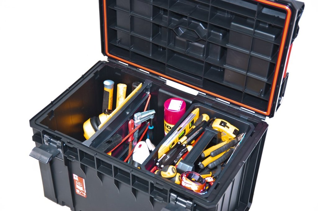 Mobilní sestava 3 kufrů na nářadí a podvozku. Rozměr celé sestavy výška 1020, šířka 745, hloubka 510 mm. Kufry i podvozek jsou vybaveny jistícím mechanizmem pro bezpečné stohování kufrů i následnou manipulaci. Vyrobeno z technického polyamidu čímž je zajištěna vysoká odolnost proti poškození. Madla, zámky a jistící mechanizmy jsou zvláště odolné proti poškození či ulomení. Jednotlivé kufry bez podvozku lze použít jako stupínek.