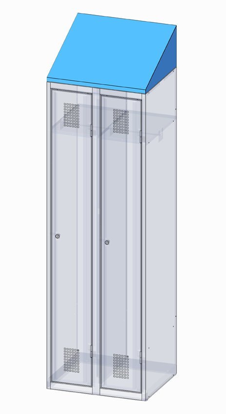 Šikmá stříška pro šatní skříně firmy POLAK. Stříšku je možné objednat dodatečně, k šatníkům se připevňuje bez spojovacího materiálu. Výška zadní části střechy je 250 mm.