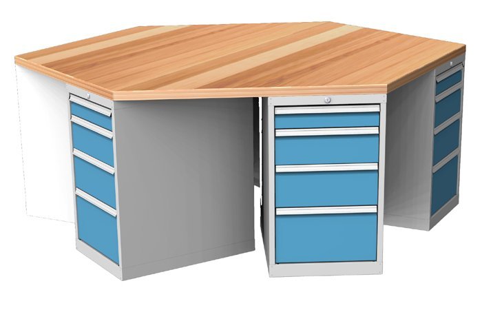 Šestihranný školní pracovní stůl s kontejnery, šířka 1990, výška 850, hloubka 2300 mm. Barva korpusu RAL 7035 světle šedá. celý popis a parametry