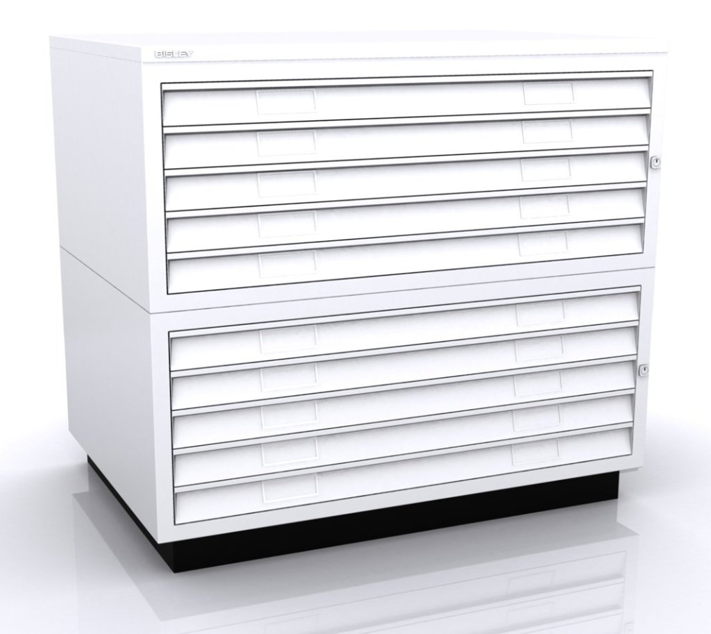 Výkresová skříň desetizásuvková A1 včetně horní desky a soklu, šířka 1010, výška 914, hloubka 691 mm. Montáž ze dvou samostatných pětizásuvkových sekcí, možno doplnit ještě tzv. mezikusem na celkový počet zásuvek 15.