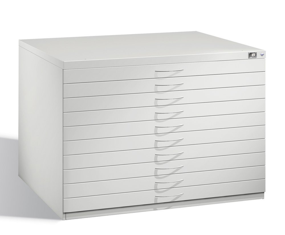 Výkresová skříň desetizásuvková formát A1, výška 760, šířka 1100, hloubka 765 mm. Odolná ocelová konstrukce, centrální zamykání na cylindrický klíč. Nosnost zásuvky 40 kg. Barva RAL 7035 světle šedá.