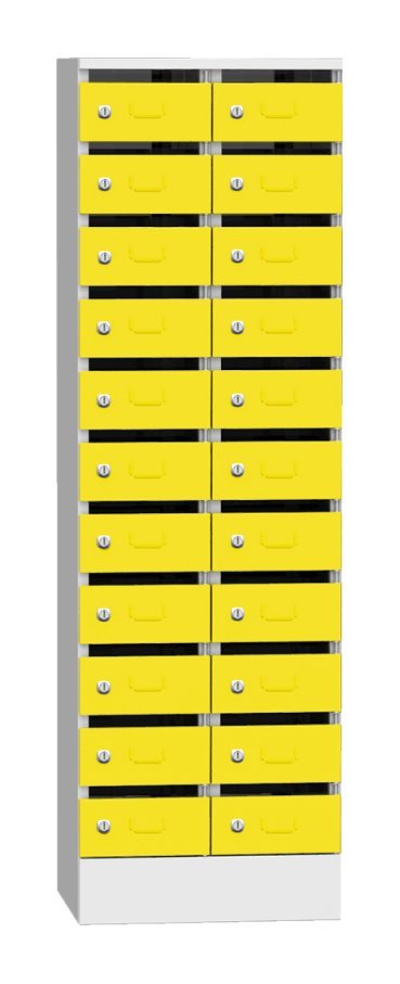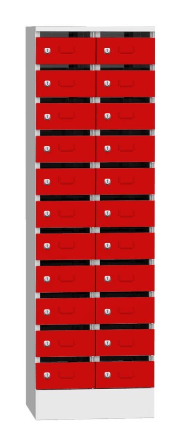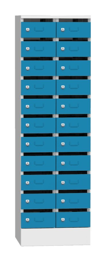 Skříň je určená na třídění pošty, dokumentů, či jiných cenností. Samostantě uzamykatelné schránky na cyl. zámek nebo uzávěr pro visací zámek. Výška 1950 x šířka 300 x hloubka 500 mm, 11 oddělení s vhozem. Barva korpusu světle šedá RAL 7035.