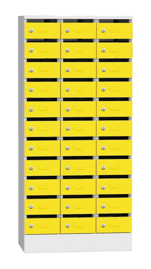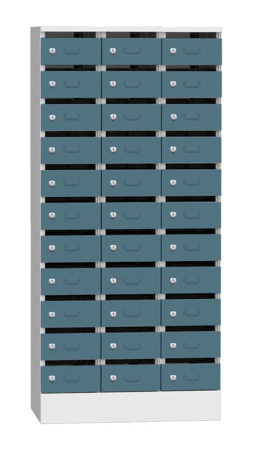 Skříň je určená na třídění pošty, dokumentů, či jiných cenností. Samostantě uzamykatelné schránky na cyl. zámek nebo uzávěr pro visací zámek. Výška 1950 x šířka 300 x hloubka 500 mm, 11 oddělení s vhozem. Barva korpusu světle šedá RAL 7035.