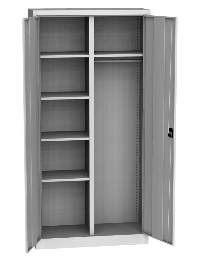Dvoudveřová skříň se soklem šatní, šířka 950, výška 1950, hloubka 400 mm, 5 polic. Dveře se skleněnou výplní. Barva korpusu RAL 7035 světle šedá.