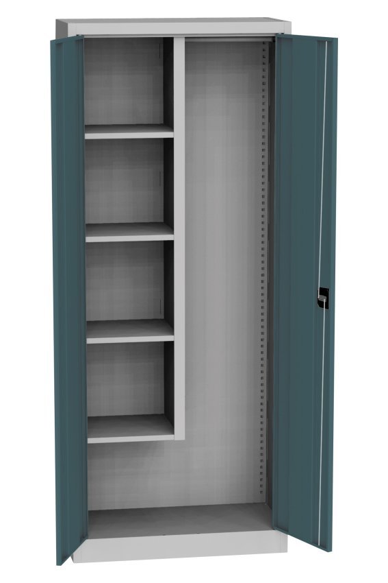 Dvoudveřová skříň se soklem dělená, šířka 800, výška 1950, hloubka 400 mm, 4 police. Dveře s drátěnou výplní. Barva korpusu RAL 7035 světle šedá.