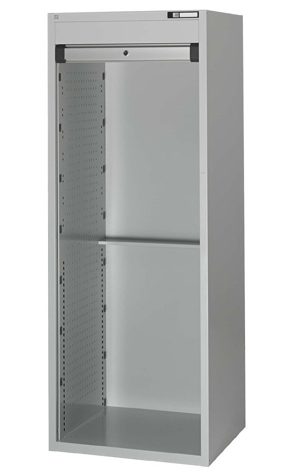 Skříň pro NC nástroje s roletou, samonavíjecí hliníková lamelová roleta, nosnost 400 kg. Výška 1950 x šířka 738 x hloubka 655 mm, bez vnitřního vybavení.