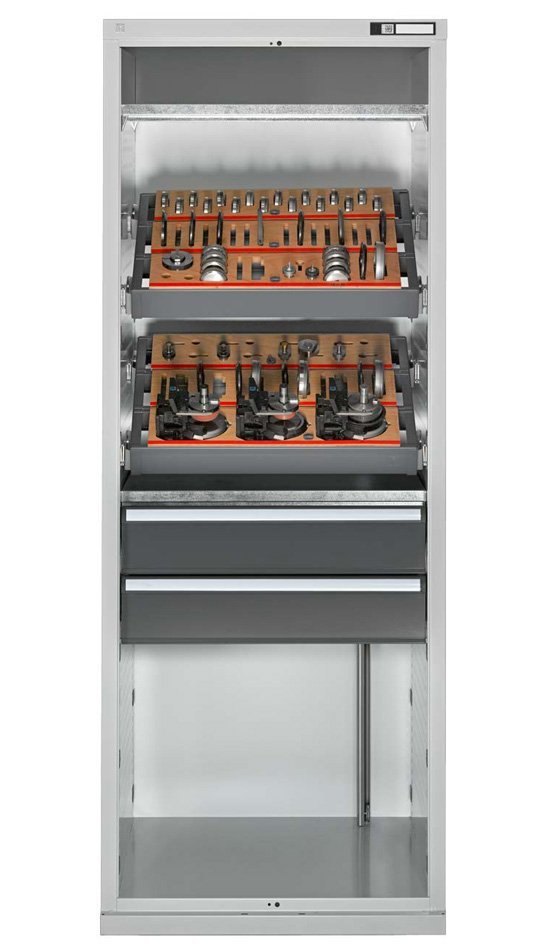Jeden originální systém řeší skladování obráběcích i vysekávacích nástrojů. Skladování obráběcích nástrojů a skladování vysekávacích nástrojů se liší pouze druhem držáků nástrojů, ukládací a transportní prostředky jsou shodné.