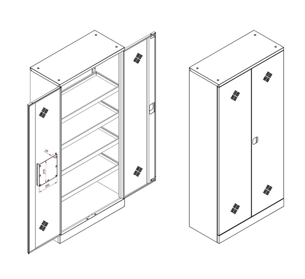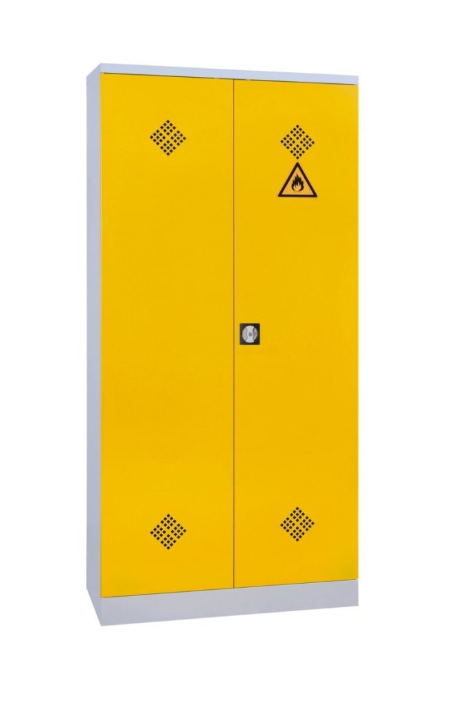 Skříň na uskladnění chemikálií s vaničkami na zachycení kapalin. Skříň je vybavena 4 přestavitelnými policemi ve tvaru vaničky. Výška 1950 x šířka 916 x hloubka 422 mm, nosnost police 50 kg, nosnost korpusu 250 kg. Barva korpusu šedá RAL 7035, barva dveří žlutá RAL 1021.