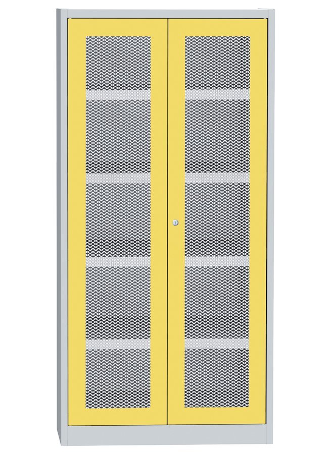 Skříň na uskladnění chemikálií s vaničkami na zachycení kapalin. Skříň je vybavena 4 přestavitelnými policemi ve tvaru vaničky s robustním perforovaným pozinkovým roštem a jednou hlubší vaničkou na dně skříně bez roštu. Výška 1950 x šířka 950 x hloubka 500 mm, nosnost police 60 kg, nosnost korpusu 300 kg. Drátěné dveře v ocelovém rámu. Barva korpusu RAL 7035 světle šedá.