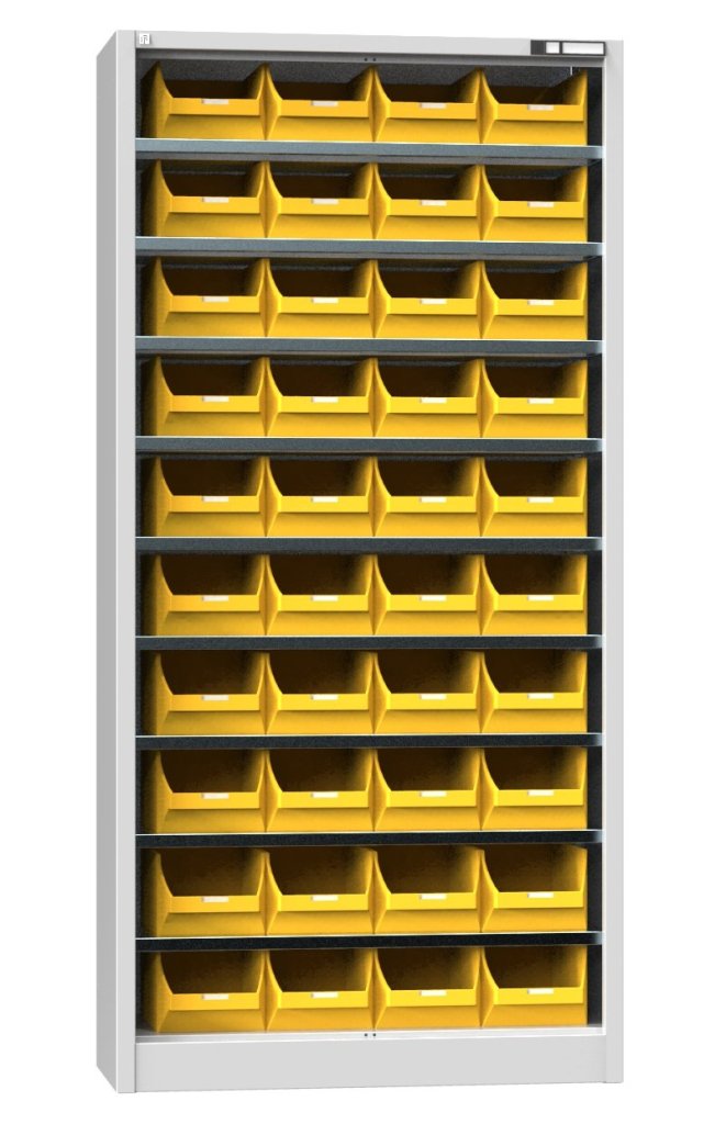 Skříň UK1 s plastovými boxy, 9x police, 40x box 4 (výška 150, šířka 204, hloubka 350 mm), nosnost skříně 400 kg. Výška 1950 x šířka 950 x hloubka 400 mm. Plastové boxy jsou dodávány v barvách modrá, červená, žlutá, zelená nebo šedá, vybrané barvy napište prosím do poznámky.