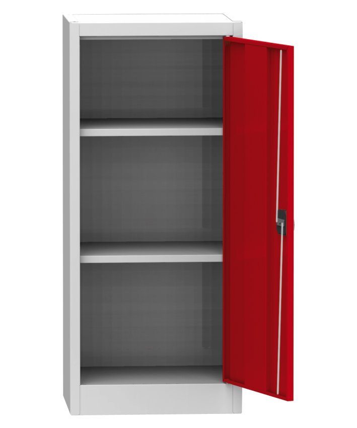 Skříň s plnými dveřmi, výška 800 x šířka 505 x hloubka 400 mm. Zamykání na cylindrický zámek s rozvorovým mechanismem. 1 x stavitelná ocelová police (nosnost 60 kg). Možnost náhrady plných dveří dveřmi se skleněnou výplní, s drátěnou výplní nebo lamino dveřmi v odstínu buk, bříza nebo třešeň. Barva korpusu RAL 7035 světle šedá.