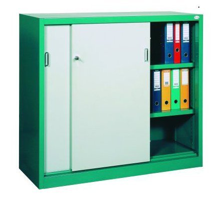 Kovová skříň s posuvnými dveřmi a se 2 policemi. Různé barvy na výběr. Výška 1040 x šířka 1000 x hloubka 435 mm. celý popis a parametry