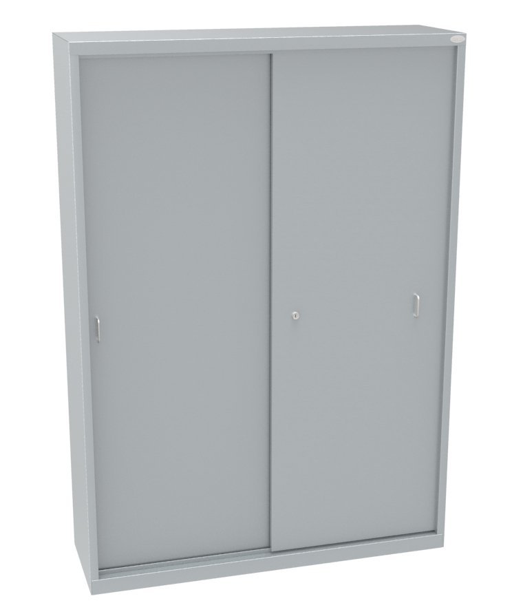 Kovová skříň s posuvnými dveřmi a se 2 policemi. Různé barvy na výběr. Výška 1040 x šířka 1400 x hloubka 435 mm.