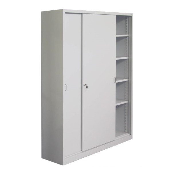 Kovová skříň s posuvnými dveřmi a se 4 policemi. Různé barvy na výběr. Výška 1990 x šířka 1200 x hloubka 435 mm.